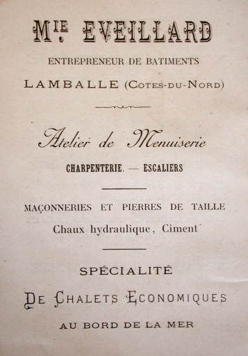 Dans : "Annuaire du Val-André" / Laveuve-Pony, Pléneuf-Val-André : Librairie Laveuve-Pony, s.d., p. 54.Encart publicitaire, 4e quart 19e siècle.