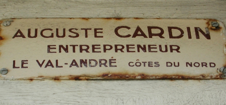 Témoignage de l'activité d'Auguste Cardin au bourg de Pléneuf. Plusieurs plaques de ce genre sont encore visibles au Val-André.Immatriculation