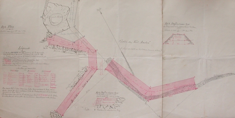 Plan des aménagements Cotard pour réaliser un port à Piégu, 1891 : brise-lame, cale, digue et balise (AD 22)Immatriculation
