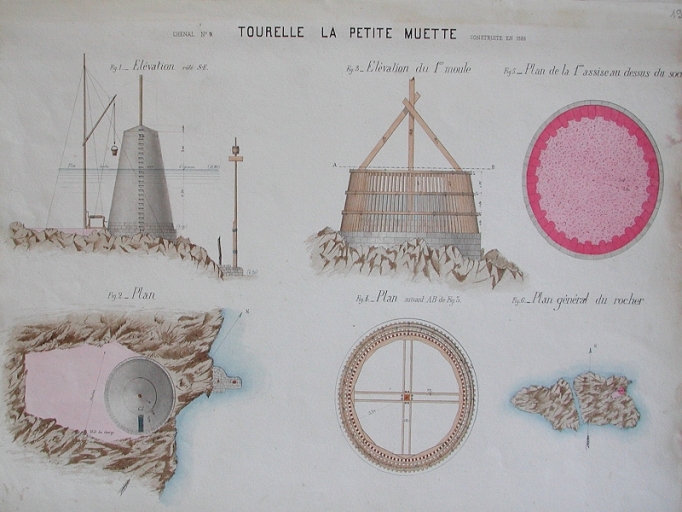 Projet de construction d'un feu sur la Petite Muette : plan, élévations, 1886 (AD 22)Immatriculation