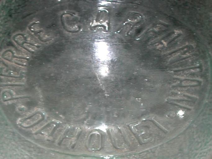 Détail de la gravure en relief sur une bouteille de soda : brassée par Pierre Carfantan, Dahouët, 1940Immatriculation
