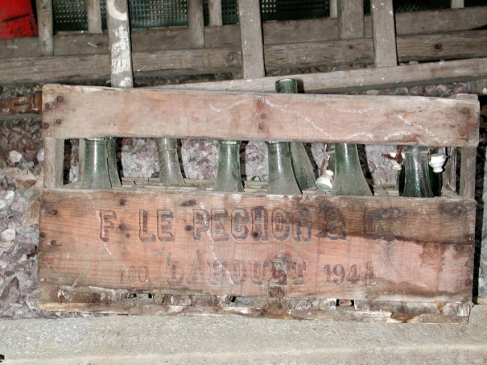 Caisse en bois pour bouteilles de soda avec l'inscription : Francisque Le Péchon, 1944Immatriculation