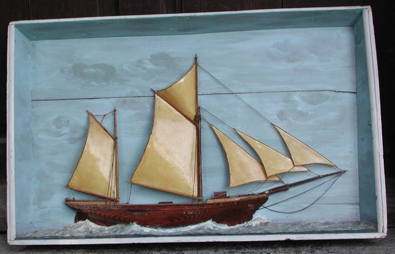 Demi-coque de goélette dans son encadrement : boîte en bois peinteImmatriculation