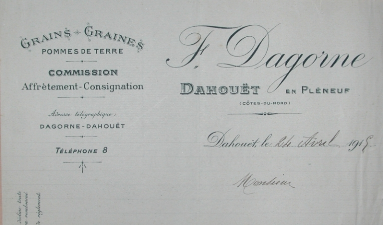 Papier en tête du commissionnaire F. Dagorne en 1915 (collection Grimaud)Immatriculation