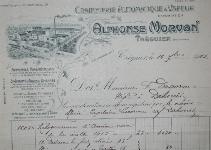 Fret acheté auprès du grainetier A. Morvan de Tréguier, acheminé à Dahouët par le navire Marie, commandé par le capitaine Lescornet au profit du courtier et armateur Dagorne en 1915 (collection Grimaud)Immatriculation