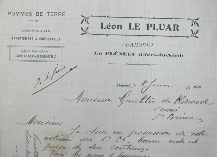 Courrier de Le Pluar, commissionnaire en pommes de terre, Dahouët, 1910 (collection Grimaud)Immatriculation
