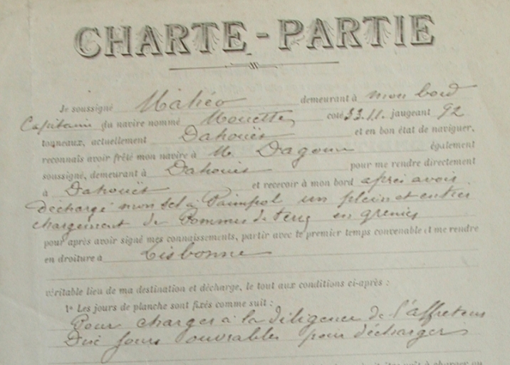 Charte-partie du navire Mouette, frétée à Dagorne par le capitaine Mahéo : déchargement de sel à Paimpol et de pommes de terre pour Lisbonne (collection Grimaud)Immatriculation