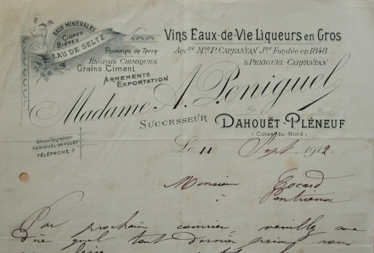 A. Péniguel, successeur, ancienne Maison P. Carfantan, fondée en 1848 : vin, au de vie, liqueurs en gros, armements export, engrais chimiquesImmatriculation