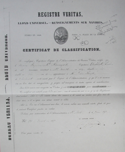 Certificat de classification de la Lloyd pour le navire chasse-marée Saint-François de Rubin de Rays, armateur de Dahouët, 1857 (collection Grimaud)Immatriculation