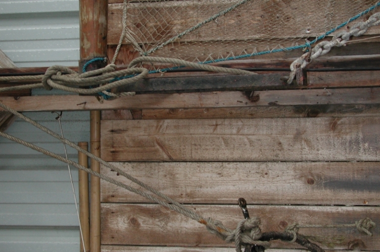 Détail du gréement du chalut à perche : la barre en bois qui réunit les deux étriers et la chaîne du bourrelet avec les annetsImmatriculation