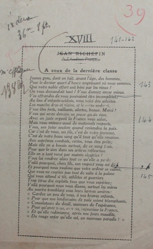 Manuscrit original dactylographié et annoté par Jean Richepin : A ceux de la dernière classe (collection Grimaud)Immatriculation