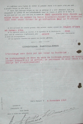 Charte-partie pour l'affrètement du navire Charlotte du capitaine Le Guilcher, par l'Agence Maritime de l'Ouest, Paimpol, 1929, pour la maison Durand (suite)Immatriculation