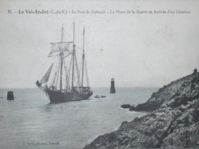 L'arrivée d'une goélette islandaise, au portant sous hunier seul, entre le phare de la Muette et la tourelle (AD 22)Immatriculation