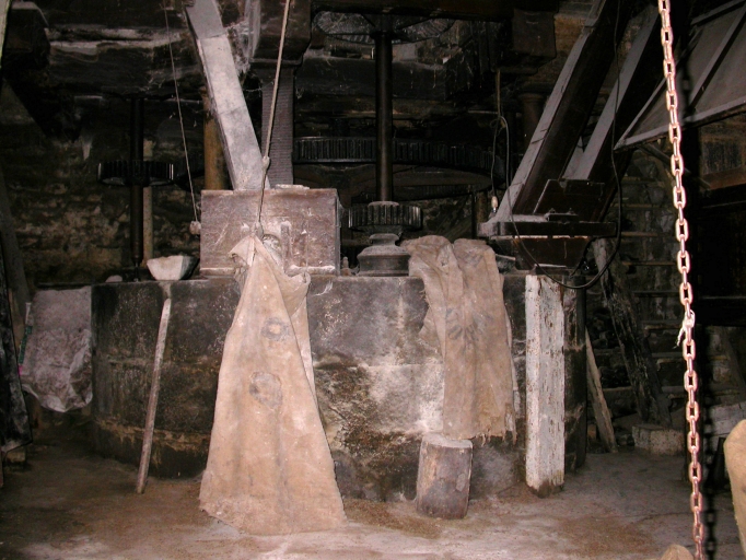 Le moulin, vue intérieure du rez-de-chaussée : rouages de transmission avec hérisson.Immatriculation