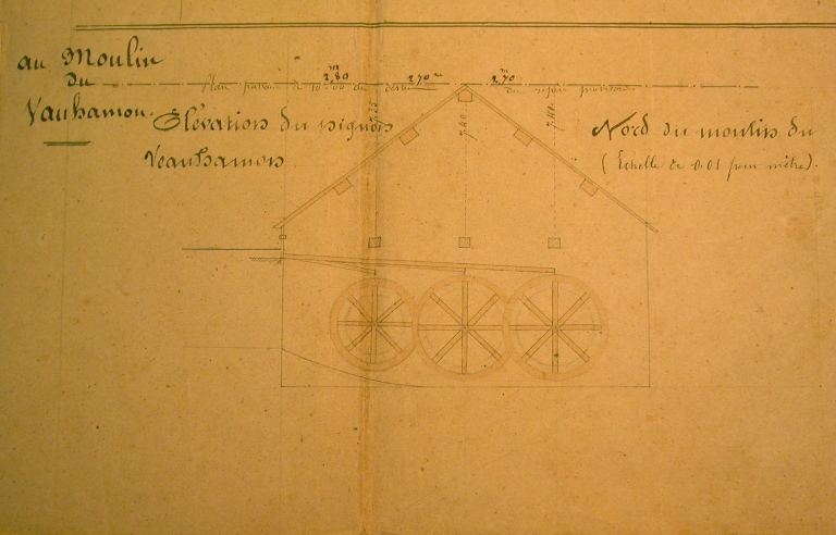 Elévation du moulin côté coursier avec vue des trois roues hydrauliques à augets (11 mai 1867).Immatriculation