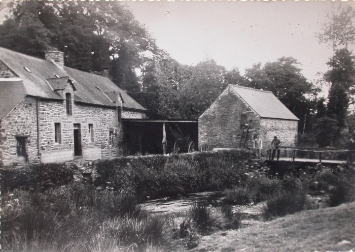 Photographie du début du 20e siècle : le logement du meunier, le moulin et l'écurie.Immatriculation