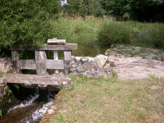 Vue générale de la vanne d'entrée du canal d'amenée et du déversoir.Immatriculation