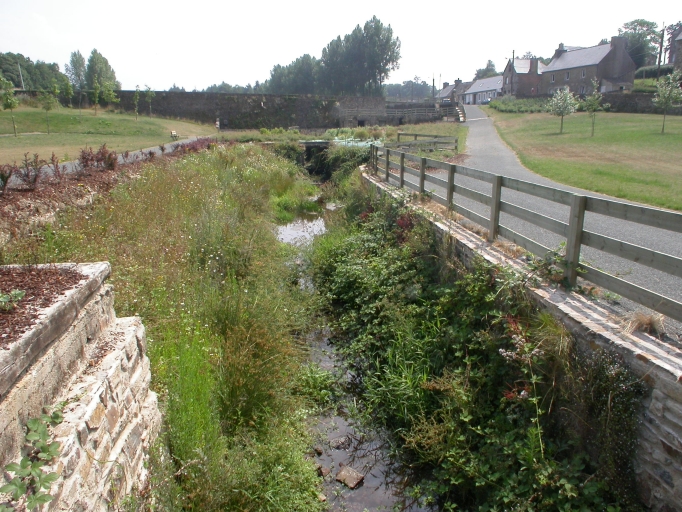 Vue générale de l'ancien canal de fuite et de la chaussée, au fond.Immatriculation