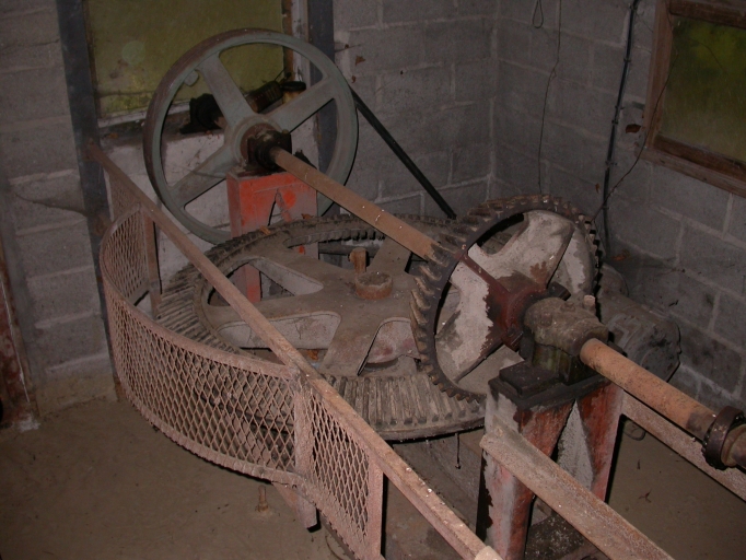 Vue intérieure du bâtiment d'eau : turbine hydraulique et alternateur situé derrière.Immatriculation