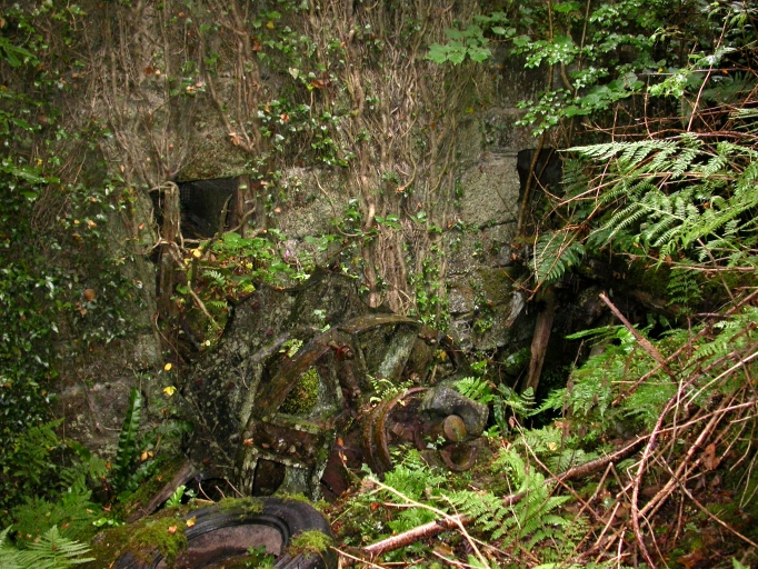 Pignon du moulin côté coursier avec vue des axes des roues hydrauliques.Immatriculation