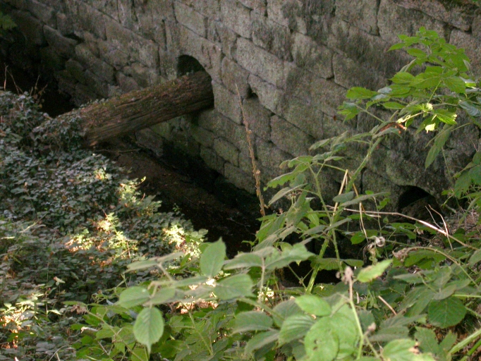 Détail du coursier et vestiges des deux arbres de roues hydrauliques.Immatriculation
