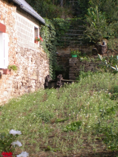 Le moulin, façade postérieure est et vue de l'ancien coursier comprenant encore l'arbre de la roue hydraulique.Immatriculation