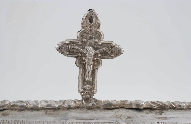 Châsse-reliquaire : détail de la croix au sommet du toitImmatriculation