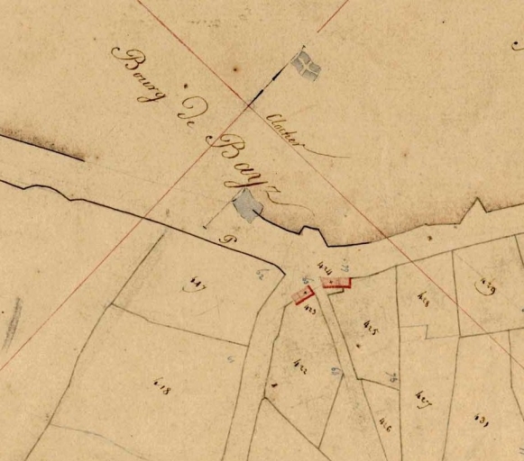 Partie sud du bourg. Extrait du cadastre de 1824, section B2 (A.D. Finistère, 3 P 076)Immatriculation