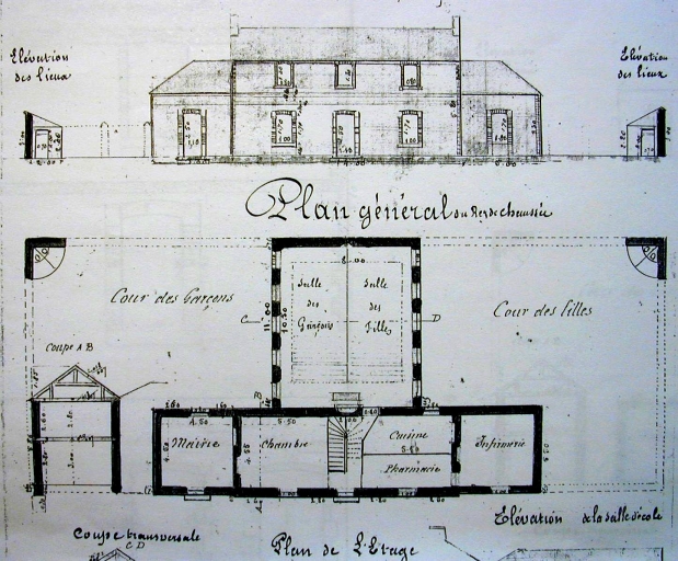 Mairie-école du bourg, élévation et plan au sol, 1873 (A.D. Finistère, 2 O 2071)Immatriculation