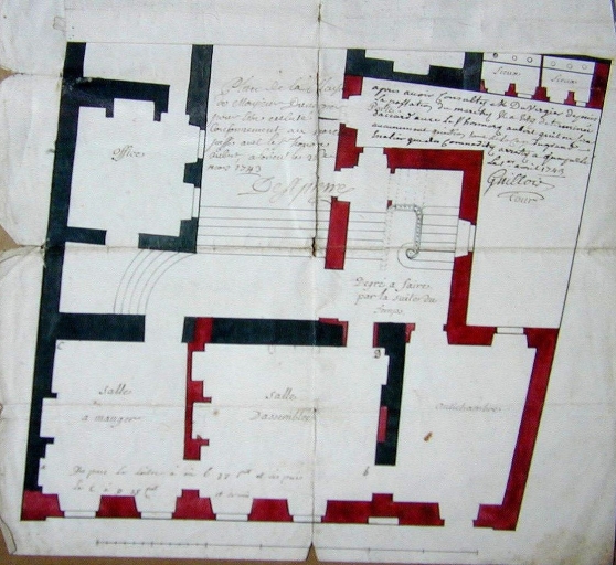 Plan au sol. En noir, parties existantes, en rouge. Projet non réalisé. Dessin signé Guillois et Saint-Pierre, 1743 (Archives privées de Kernault, Mellac)Immatriculation