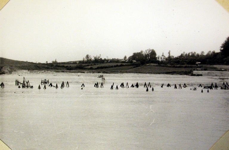 Vue des obstructions et défenses anti-débarquement de la plage de Porsmilin à mi marée : tétraédres et portes Maginot, n° 88, rapport Pinczon du Sel. Livre IV, vers 1947, Service Historique de la Marine, BrestImmatriculation