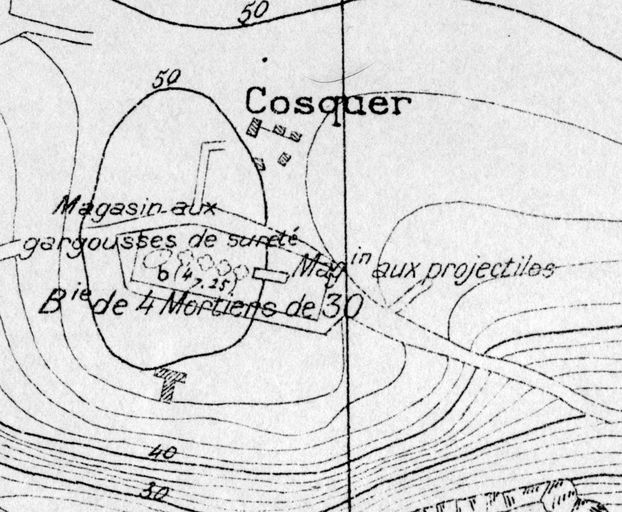 Batterie de mortiers (4 mortiers M. de 30 cm. modèle 1883 sur affûts M modèle 1883 à pivot antérieur puis modèle 1883-T-1893 sur affûts M modèle 1883 à pivot antérieur modifiés), Le Cosquer, Pointe du Grand Minou (Locmaria-Plouzané),