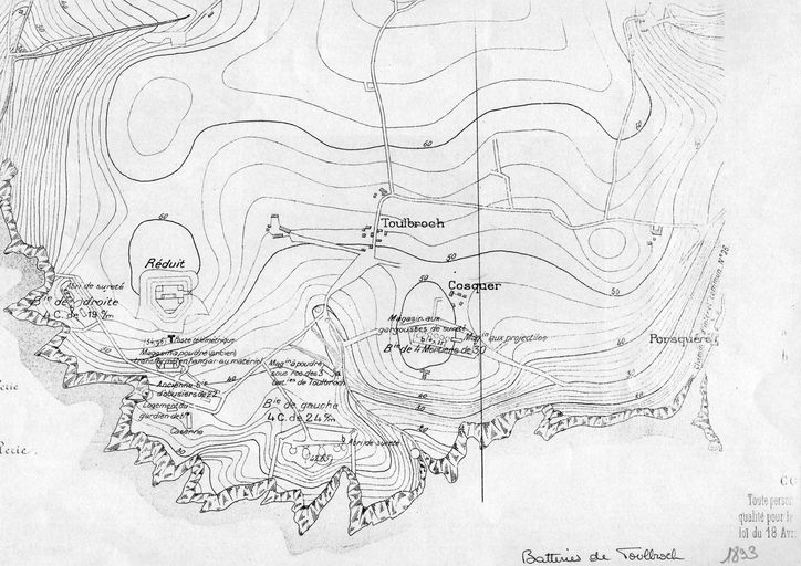 Plan de l'ensemble fortifié de Toulbroc'h, Atlas des batteries de côte, n° 20 : côte de Brest, 1893, VincennesImmatriculation