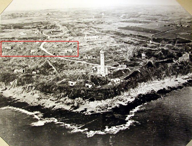 Vue aérienne de l'ensemble fortifié du Portzic : en rouge, la batterie lourde de 152 mm du Portzic, n° 107, rapport Pinczon du Sel. Livre IV, vers 1947, Service Historique de la Marine, BrestImmatriculation