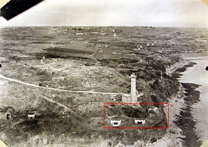Brest, pointe du Portzic : vue aérienne de l'ensemble fortifié. En rouge,batterie lourde codée M.K.B. Portzic III , n° 107, rapport Pinczon du Sel. Livre IV, vers 1947, Service Historique de la Marine, BrestImmatriculation