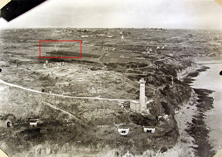 Vue aérienne de l'ensemble fortifié du Portzic : en rouge, l'emplacement de la batterie antiaérienne de 105 mm, n° 106, rapport Pinczon du Sel. Livre IV, vers 1947, Service Historique de la Marine, BrestImmatriculation
