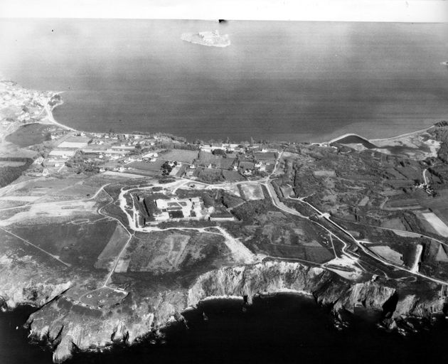 Vue aérienne des fortifications de Quélern : batteries, réduit, lignes de Quélern, Fonds M.H.Immatriculation