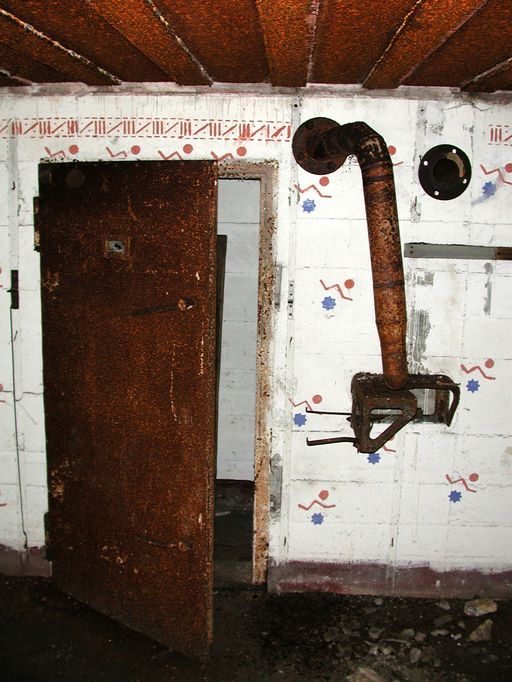 Vue de l'abri à personnel de tye 128 des Quatre Pompes : les portes blindées sont encore en place ainsi que les tuyaux de ventilationImmatriculation