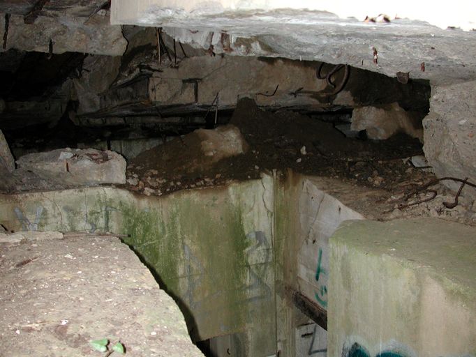 Vue intérieure (état en 2003). Le bunker a subi une forte explosion interne : la dalle de couverture s'est désolidarisée des murs périphériques...Immatriculation