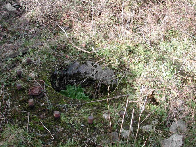 Vue des vestiges des encuvements dans le champ de la Marine : boulons de fixation d'un canonImmatriculation