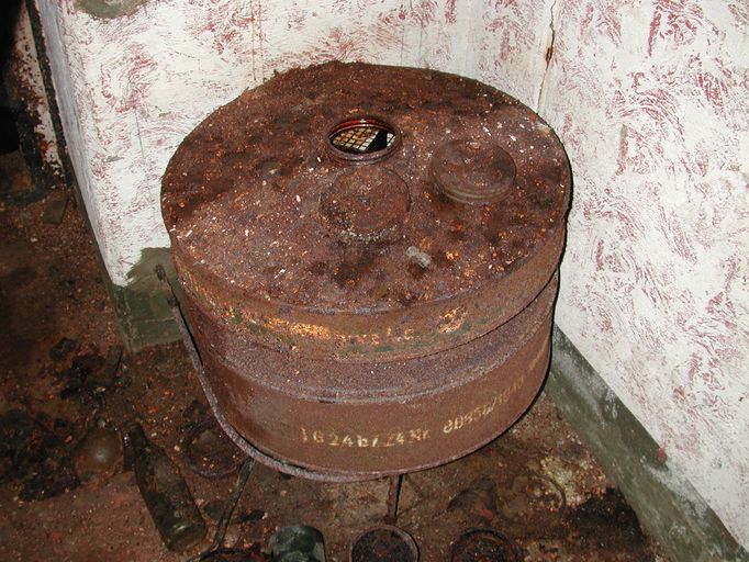 Vue des objets - ici au centre de la photographie un filtre - se trouvant dans le bunker (état en 2003)Immatriculation