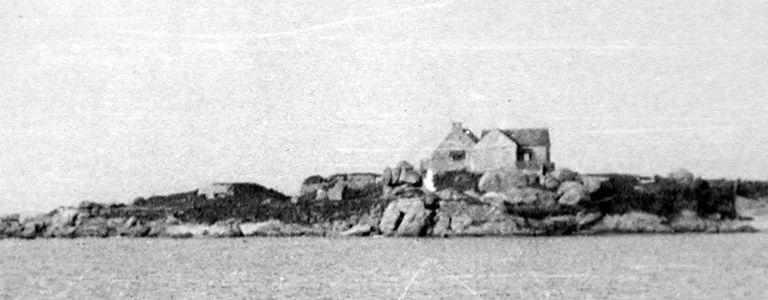 Vue de l'ensemble fortifié de Beg ar Scaf vers 1947 : de gauche à droite, la casemate, la batterie de côte et le corps de gardeImmatriculation