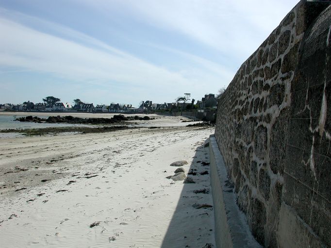 Vue de la plage de Pontusval : à droite, mur de soutènement en maçonnerie de granite faisant digue (état en 2003)Immatriculation