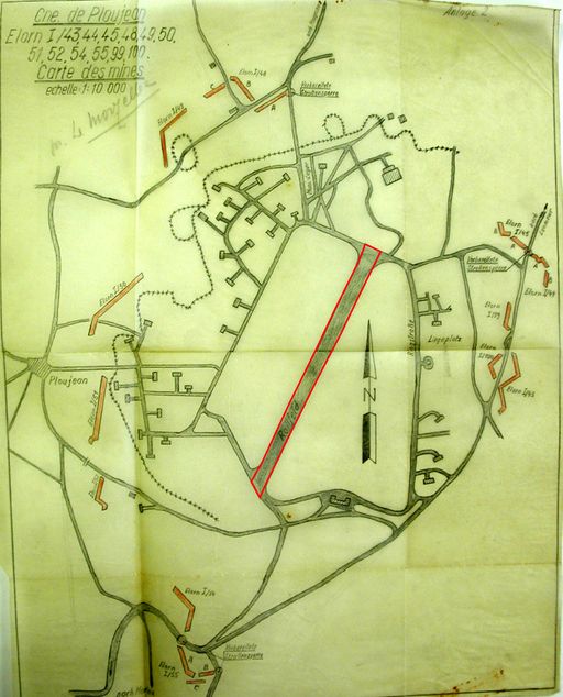 Plan de la base aérienne de Morlaix-Ploujean, vers 1944 (calque). Détourée en rouge, la piste principale d'envolImmatriculation