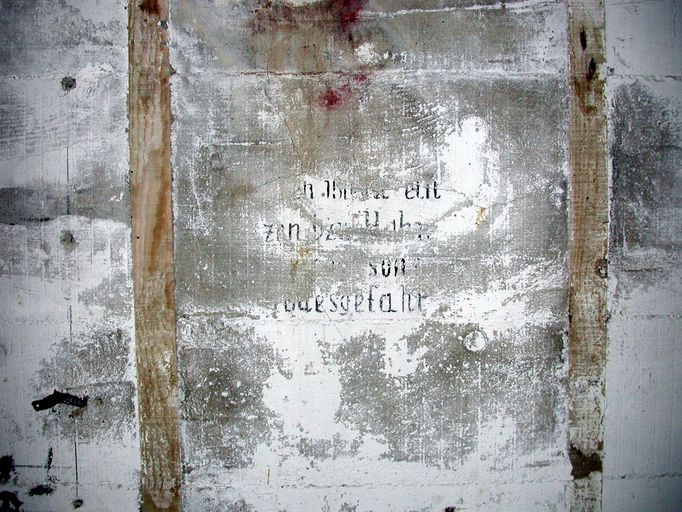 Landéda, île Cézon : abri de type 621, détail de l'inscription réglementaire du poêle de forteresse. Combien de temps tiendra encore cette inscription ? (état au 31 mai 2003)Immatriculation