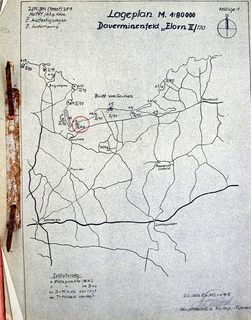 Plan de situation des champs de mines de l'ensemble fortifié de Penn ar C'hleuz codé A7, mars 1943, sources Fort MontbareyImmatriculation