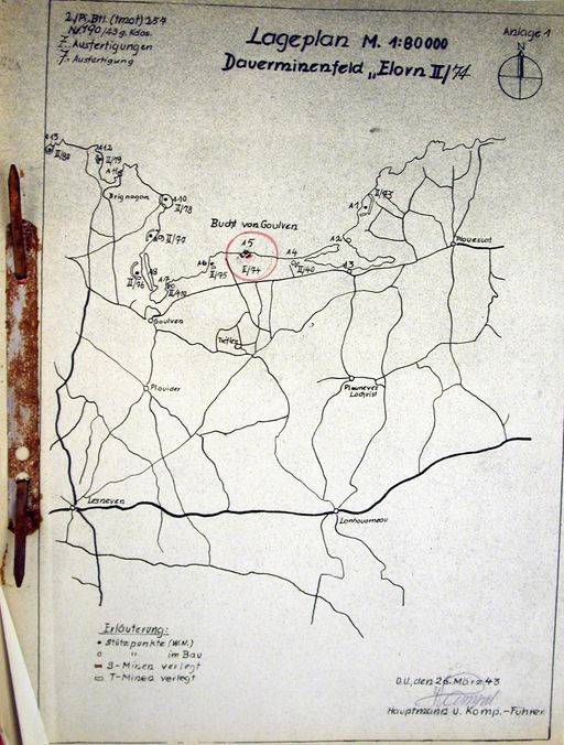 Plan de situation des champs de mines de l'ensemble fortifié de Roc'h Vran codé A5, mars 1943, sources Fort MontbareyImmatriculation