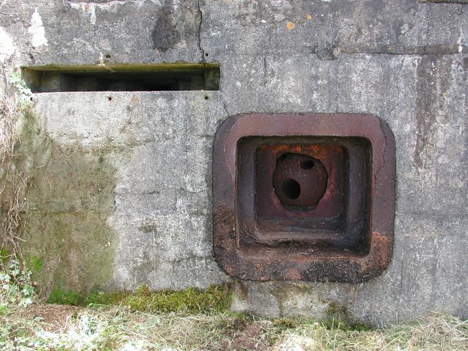 Détail de la rotule du canon toujours en place. Par la meurtrière, on peut entrevoir un marquageImmatriculation