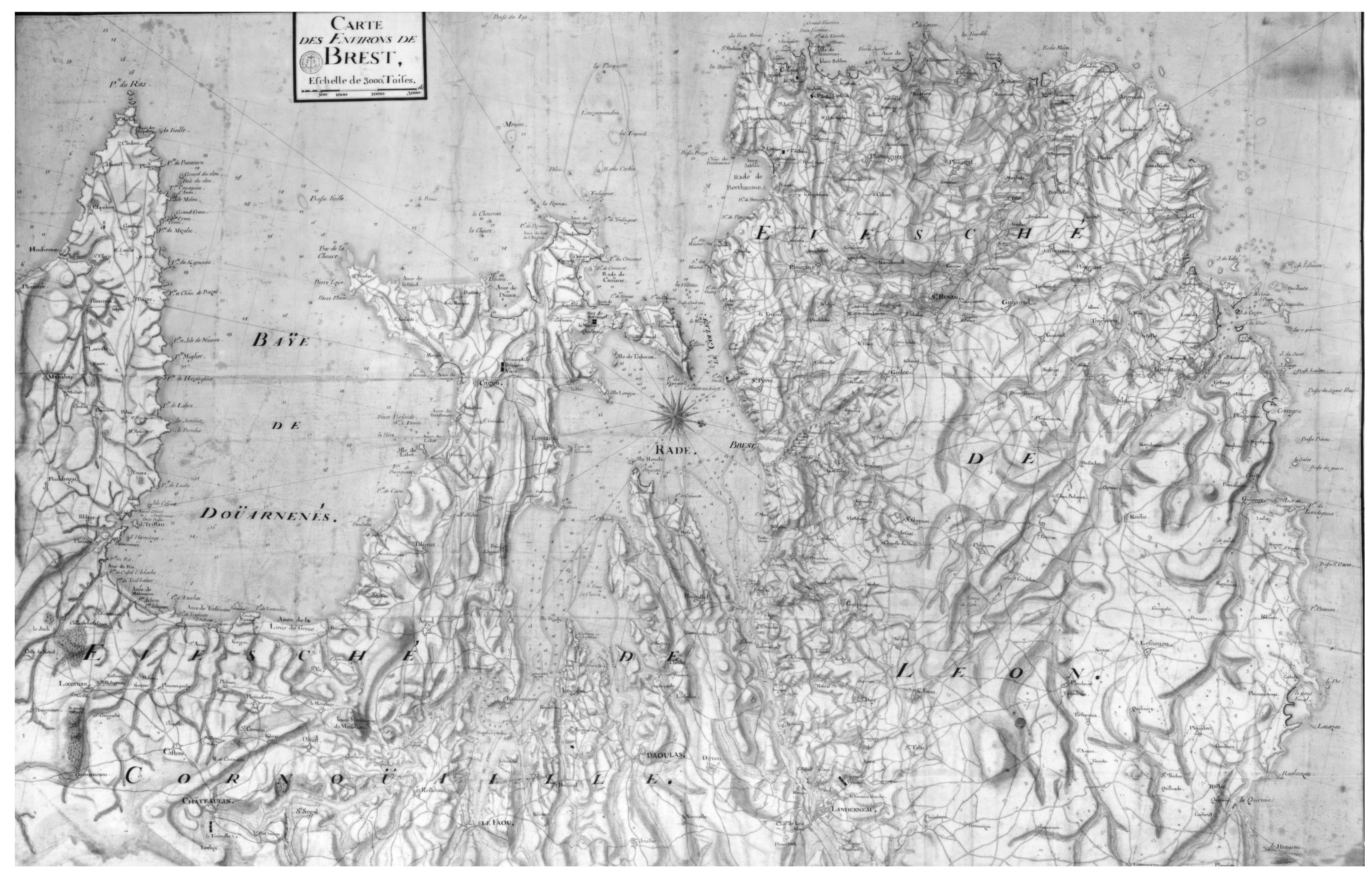 Carte des environs de Brest, 1695, auteur non précisé, les retranchements sont représentés par un trait noir et les batteries en rouge, Service Historique de la Marine, Vincennes, portefeuille 46, division 2 (association Cézon, document n° 9)Immatriculation