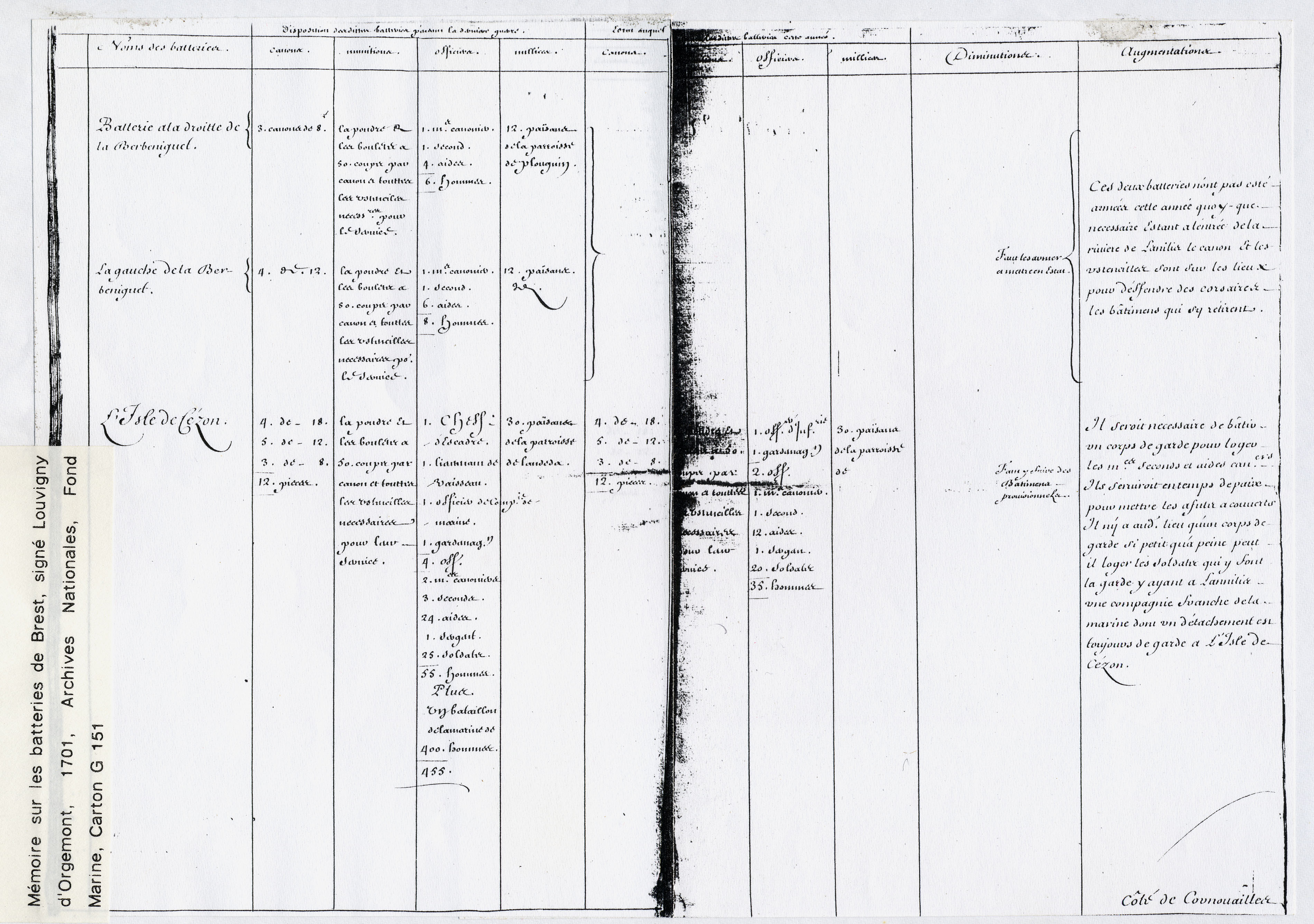 Mémoire sur les batteries de Brest par Louvigny d'Orgemont, 1701, Archives nationales, Fond Marine, carton G 151 E59, repère G14, p. 33 (Yann Le Nestour, Florence Fröhlig - association Cézon, document n° 13)Immatriculation